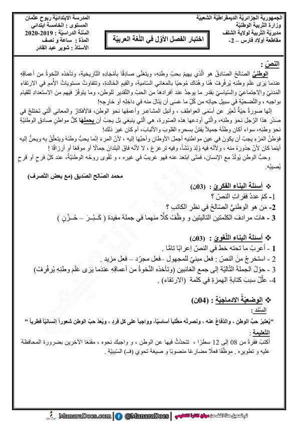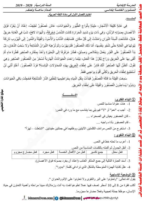 اختبار الفصل الاول مع الحل في مادة اللغة العربية للسنة الخامسة ابتدائي الجيل الثاني 2020 2019