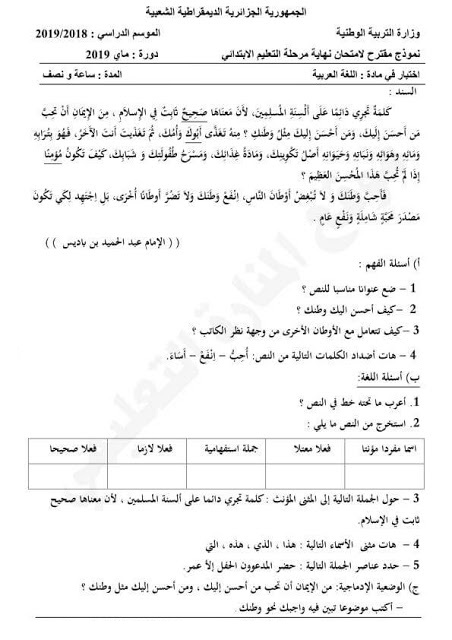 نموذج اختبار السنة الخامسة ابتدائي في اللغة العربية الفصل الثالث مع الحل الجيل الجديد 2019 2020