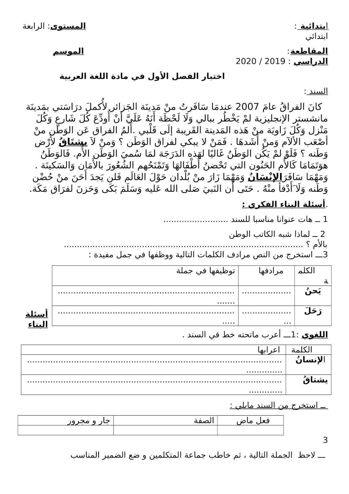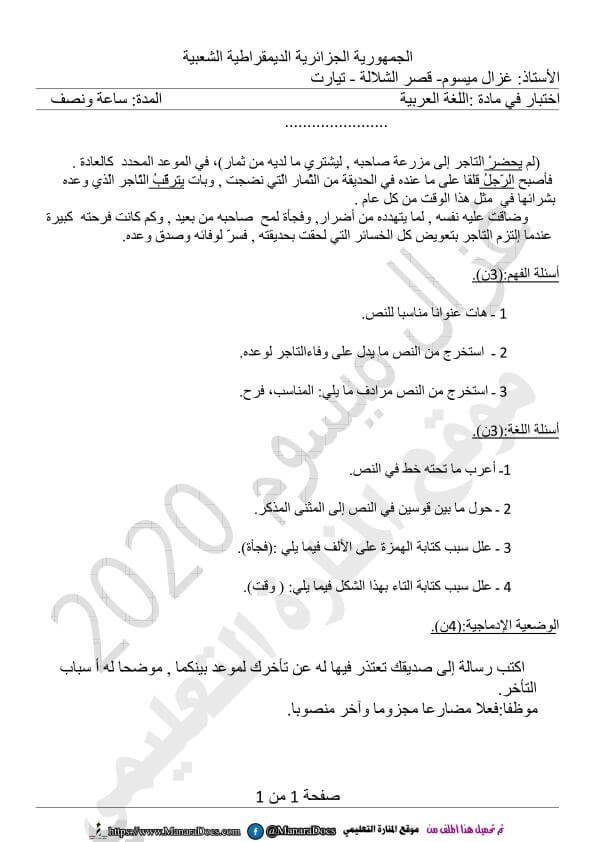 اختبارات لغة عربية السنة الرابعة ابتدائي المجموعة الثالثة