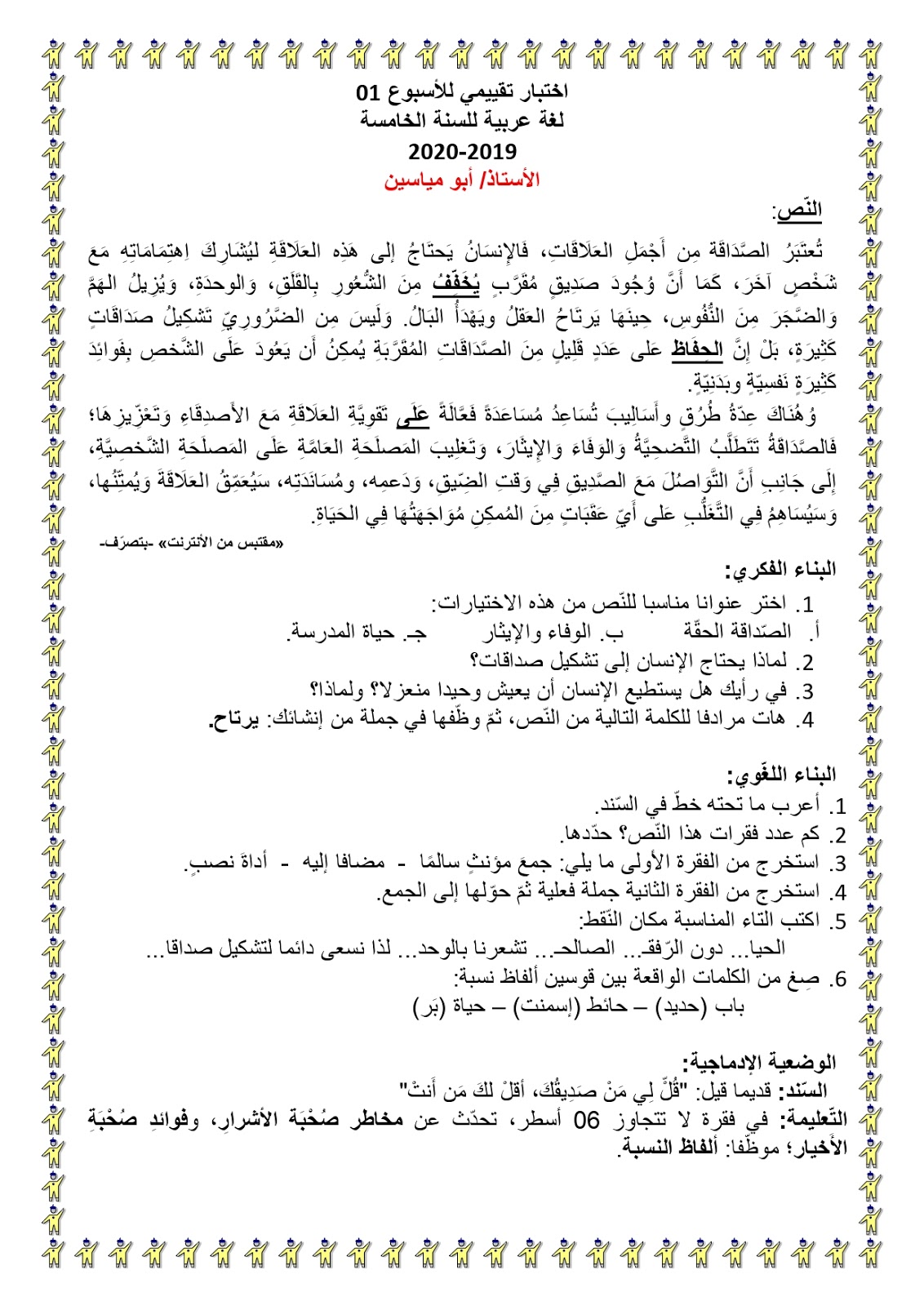 اختبار تقييمي للأسبوع 01 لغة عربية للسنة الخامسة 2019 2020 Word