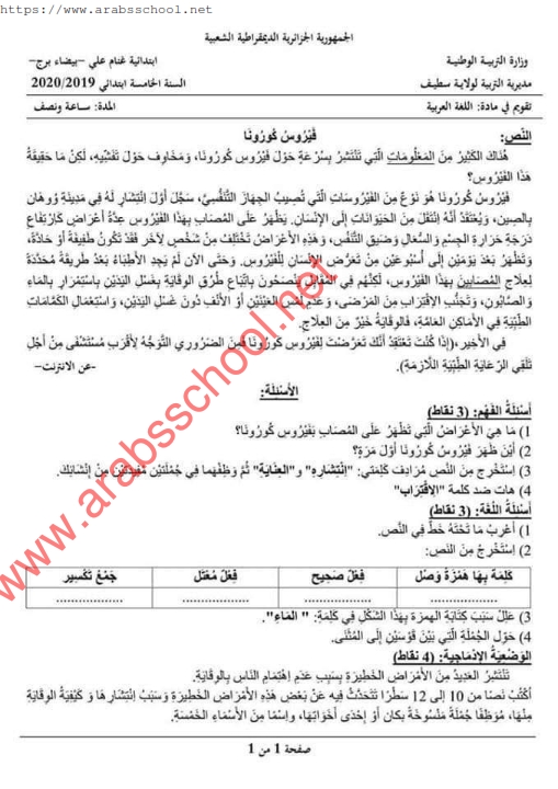 اختبار اللغة العربية للسنة الخامسة فيروس كورونا 2020 Learn With Imy تعلم مع ايمي