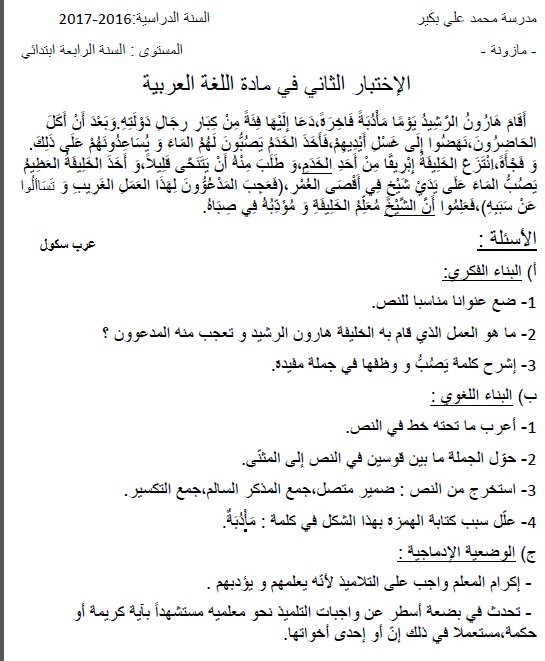 نماذج اختبارات في اللغة العربية للسنة الرابعة ابتدائي الفصل الثاني 2017 2018