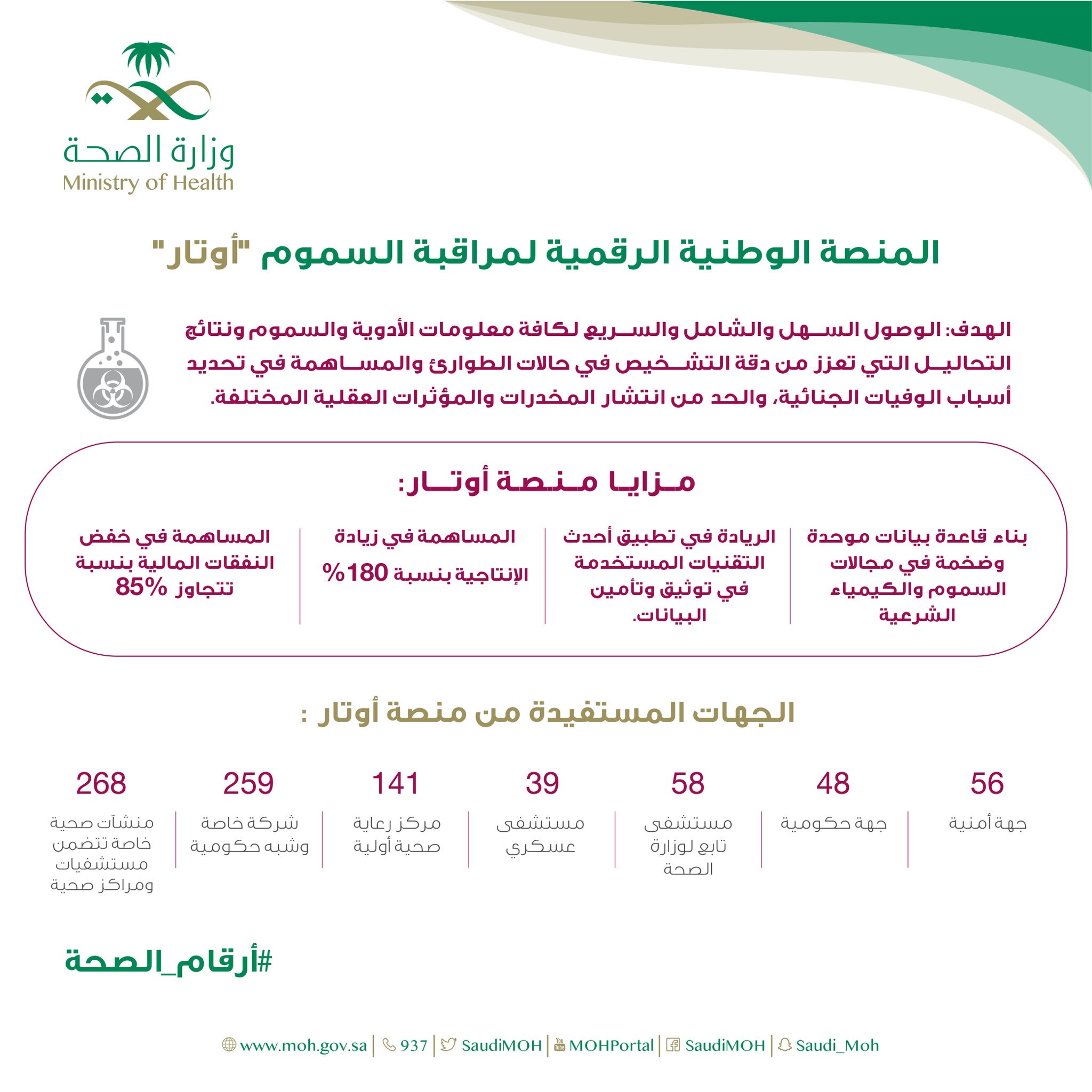 و ز ا ر ة ا لـ صـ حـ ة السعودية على تويتر المنصة الوطنية الرقمية لمراقبة السموم أوتار تهدف إلى الوصول السريع لكافة معلومات الأدوية والسموم ونتائج التحاليل التي تعزز من