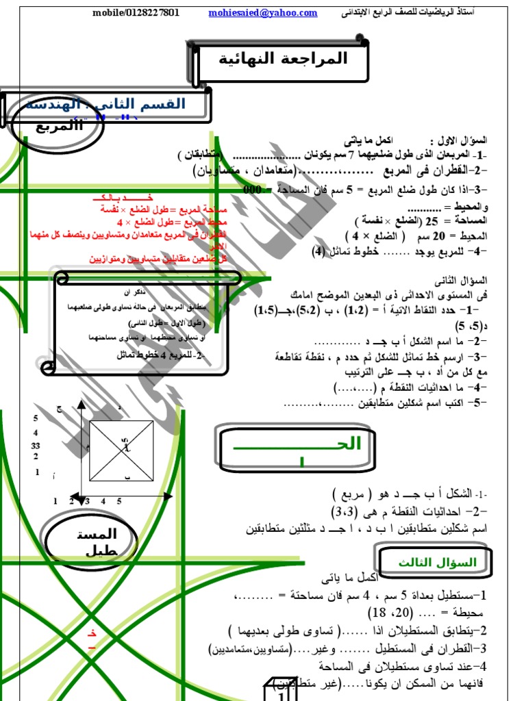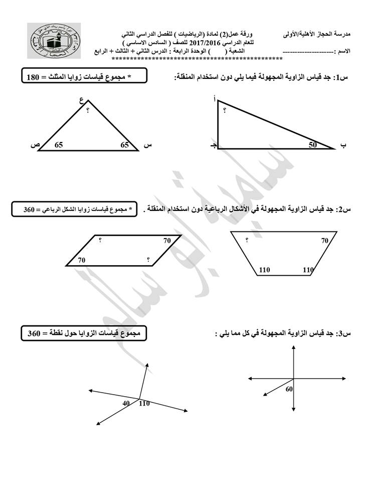 اوراق عمل شرح في الرياضيات للصف السادس خطوط التماثل والمجسمات والمساحات الفصل الثاني