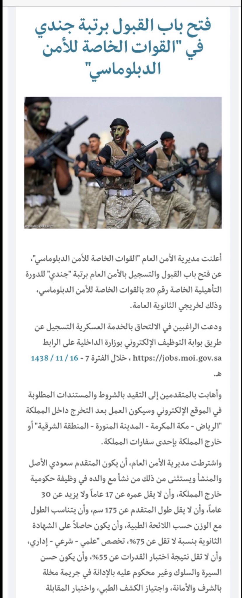 وظايف عسكريه A Twitteren القوات الخاصة للامن الدبلوماسي تعلن عن فتح باب القبول لرتبة جندي ابتداء من تاريخ ٧ ١٤٣٨ ١١ ١٦ عبر الرابط التالي Https T Co On3dialmbw Https T Co Piwyfd95qn