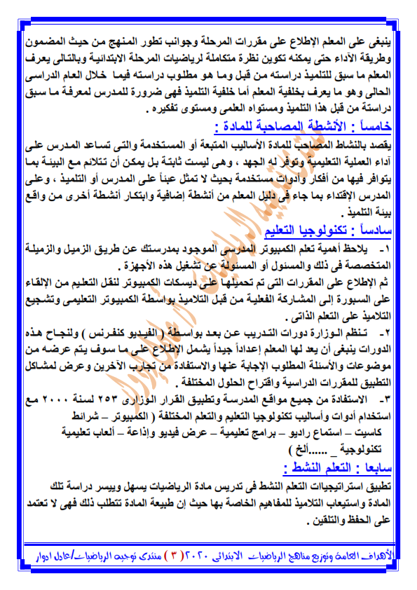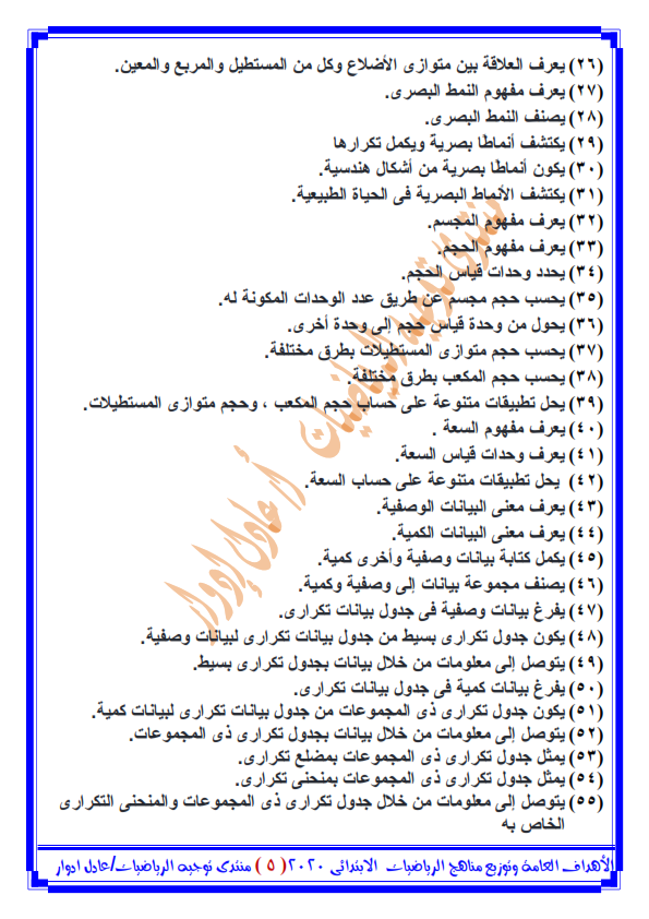 الأهداف العامة لتدريس الرياضيات للمرحلة الأبتدائية 2019 2020 توزيع المنهج نواتج التعلم