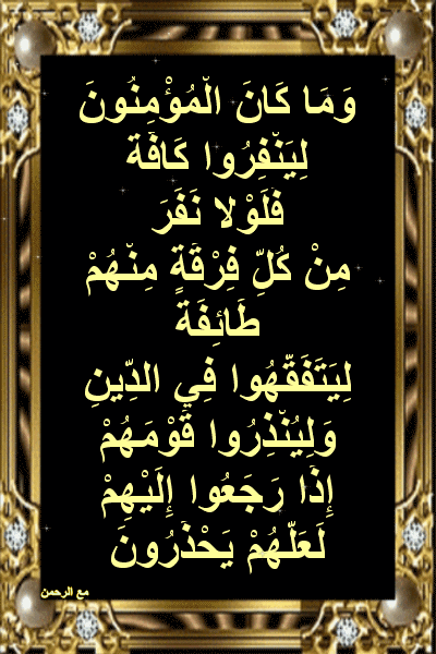 و م ا ك ان ال م ؤ م ن ون ل ي ن ف ر وا ك اف ة ف ل و ل ا ن ف ر م ن ك ل ف ر ق ة م ن ه م ط ائ ف ة ل ي ت ف ق ه وا ف ي الد ين و ل ي ن ذ ر وا ق و م ه م إ ذ ا ر ج ع وا إ ل ي ه م ل ع ل ه م ي ح ذ ر ون تفسير ابن كثير التوبة 122
